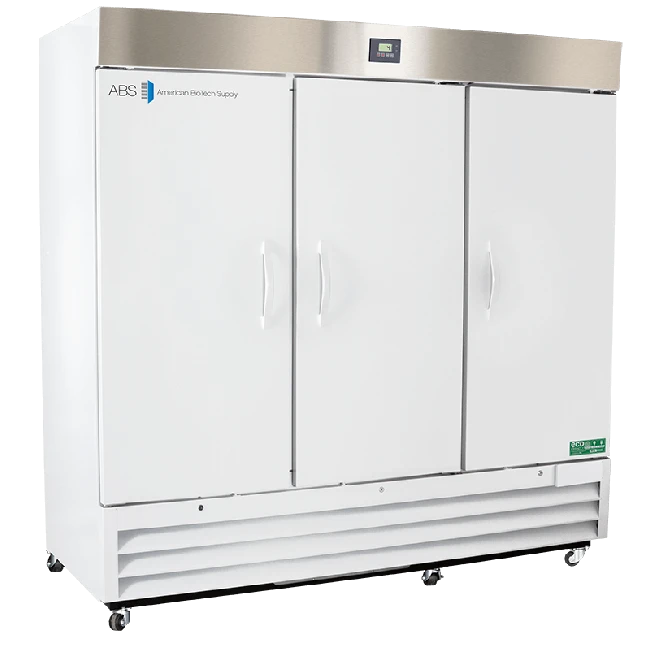 The American BioTech Supply Pharmacy Solid Door Refrigerator, 72 Cu. Ft., ABT-72S features a microprocessor temperature controller and display, allowing for precise temperature control, verification and recovery versus mechanical style thermostats. An interior fan driven, forced-draft air circulation system provides excellent temperature uniformity and recovery after door openings. Critical samples and supplies are security backed with an extensive package of audible and visual alarms.
