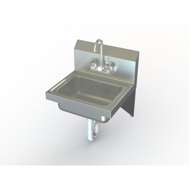 This stainless steel hand sink from Aero Manufacturing is wall mounted and includes a gooseneck faucet.