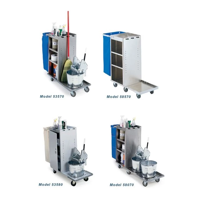 Lakeside / Premier Housekeeping Carts Fixed Platform Cart Specifications • All stainless steel construction. •  4" ball-bearing rubber-wheel casters. •  Complies with OSHA and OBRA standards. •  Blue nylon bag. •  4” casters - 2 ea. swivel, 2 ea. fixed, with No-Mark polyurethane wheels. •  Fold-up handle/bag frame. •  3" deep recessed top tray. •  Front end platform bumpers. •  Welded cabinet construction. •  Roomy storage compartment with adjustable shelves, key-lock security door version available. •  Shipped partially assembled.   Fixed Platform Cart Model Description Overall Size Platform Size Single Bucket Fits Open Area Supply Compartment 53570 Without Door 18" x 46" x