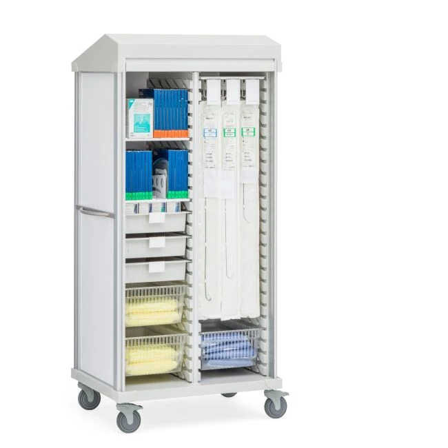 Door include 1 counterbalanced roll-top doors. Preconfigured cart includes 3 single-compartment shelves, 4 shelf dividers, 3 9-hook cath managers, 3 6" trays with dividers, 3 9" baskets, and label holders. The cart has a lightweight aluminum case, easy-grip vertical aluminum handles, and lockable 5" medical-grade casters.