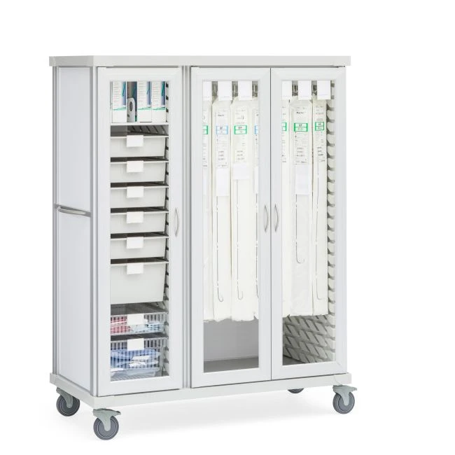 Door choices include 2 counterbalanced roll-top doors or 3 lockable tempered glass doors. Preconfigured catheter and medical supply cart includes 1 single-compartment shelf, 1 double-compartment shelf, 2 shelf dividers, 7 9-hook cath managers, 5 6? trays with dividers, 1 9? tray with dividers, 1 6? basket, 1 9? basket, and label holders.