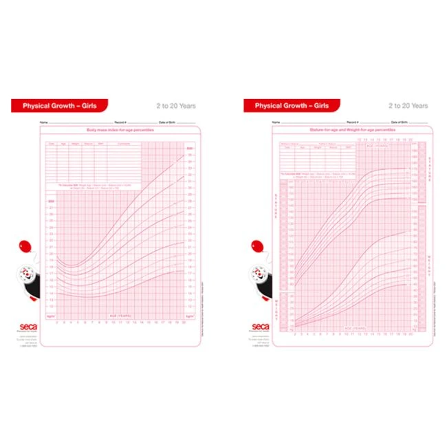 Seca 406 growth charts for girls (pink) are the fast and convenient way to track length/height, weight, head circumference and Body-Mass-Index percentiles by age. Plot children from 2 to 20 years of age.
