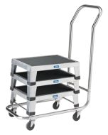 Extra Large platform. Slip resistant corrugated rubber top surface. Tip resistant design. Heavy gauge legs and handles. Transport cart available for convenient storage and mobility. Stainless steel construction. Can stack safely for increased height and interlock to create larger platform. Dimensions: 14"D x 19"W x 6"H.