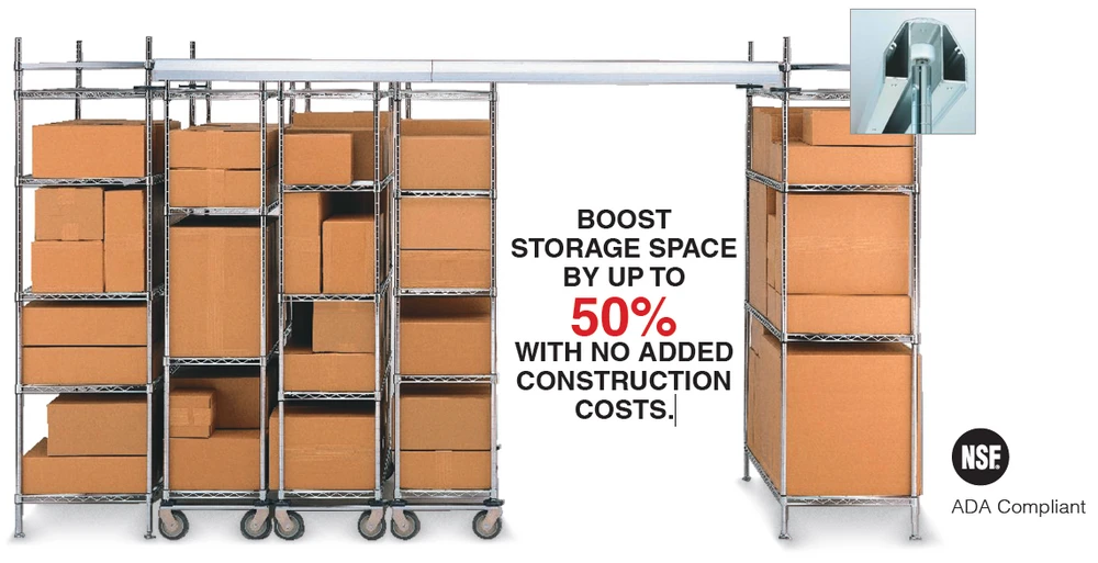 This design helps healthcare environments maintain efficient supply organization, quick access to stored materials, and streamlined workflows for clinical and support staff. The overhead track configuration also keeps floors clear, supporting easier cleaning and allowing carts and equipment to move freely through storage areas—an important consideration for facilities focused on sanitation, infection control, and operational efficiency.