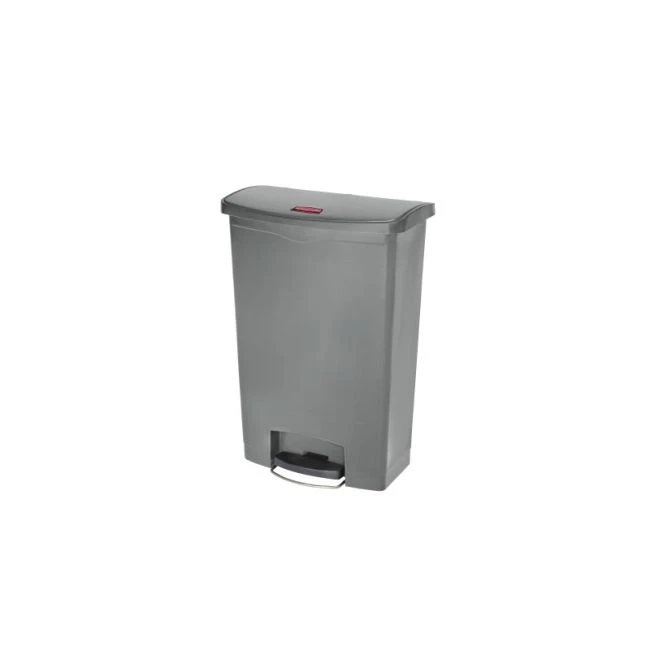 The Rubbermaid Slim Jim 24 Gallon Step on Can, Gray, 1883606 has a small footprint and offers increased pedal clearance for easy foot access and hands-free waste disposal. A tight-fitting lid has a controlled close to reduce noise and an internal hinge design to prevent wall damage. Offering easy maintenance, this step-on container features a liner retainer band to securely hold liner bags.
