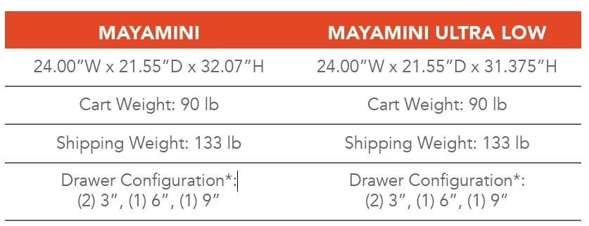 The MayaMini was engineered to fit in tight spaces. Its modified base and smaller casters allow it to be utilized under counters providing a flexible storage solution and an extra work surface. The MayaMini is also available in Ultra Low.