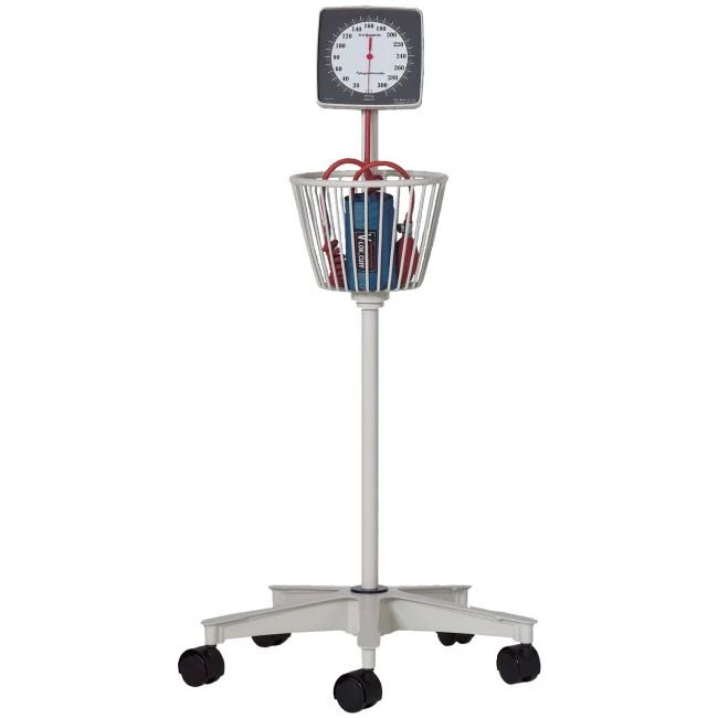 The manometer housing is neutral white ABS plastic and is mounted at a 20 degree angle for ease of viewing. The Baum Roll-By™ is 39 inches tall. The contoured handle and five point wheel base (20" dia.) are die-cast aluminum. Wheels are 2 inch hooded casters with mar-resistant polyurethane treads. The support pole and instrument mounting tube are heavy gauge, machined aluminum tubing. The large storage basket is nylon coated steel and aluminum. All metal parts are finished with neutral white baked enamel. The standard Adult Calibrated® V-Lok® Cuff is medium blue Dacron™ polyester.